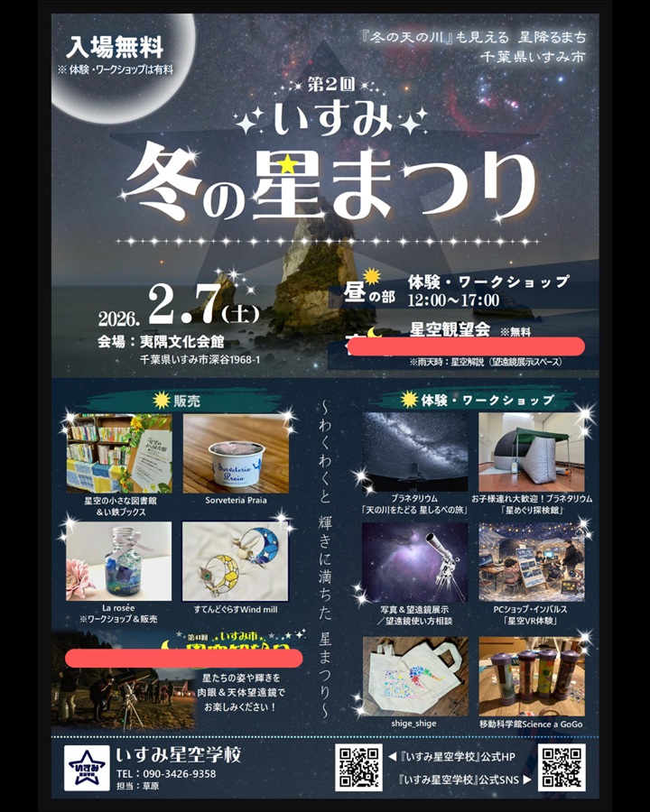 - 第2回いすみ冬の星まつり2月5日:降雪予報のため、夜の部(星空観望会)は中止することとなりました。 2026年2月7日(土)に、夷隅文… 続きを読む: 第2回いすみ冬の星まつり