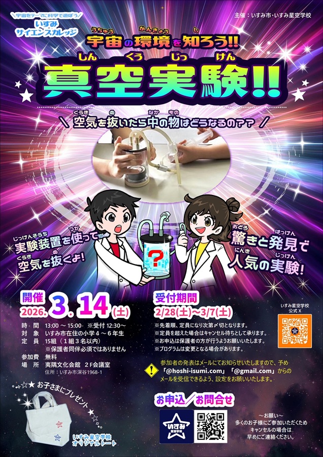 - サイエンスカレッジ in いすみ(2026年3月14日)サイエンスカレッジは、宇宙をテーマにした体験活動を通して、科学の楽しさや不思議さに触れ、科学への関心や探求意欲… 続きを読む: サイエンスカレッジ in いすみ(2026年3月14日)